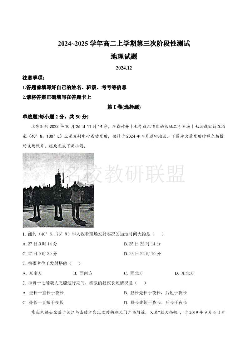 山东省济南市莱芜第一中学2024-2025学年高二上学期第三次阶段性测试 地理.pdf