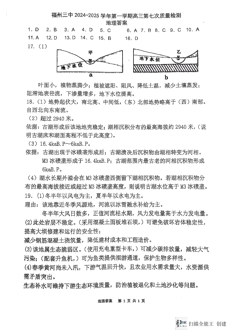 福建省福州第三中学2024-2025学年高三第七次质量检测 地理答案.pdf