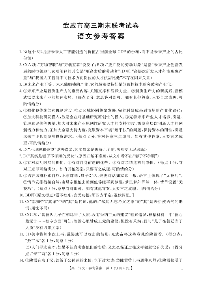 甘肃省武威市2025届高三上学期1月期末联考 语文答案.pdf