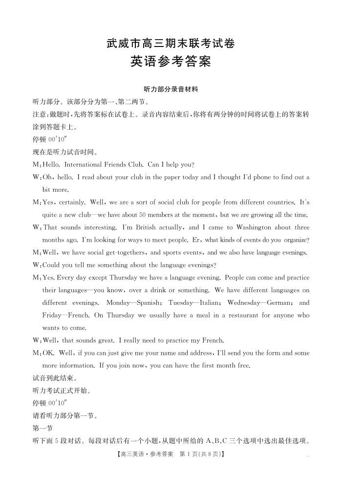 甘肃省武威市2025届高三上学期1月期末联考 英语答案.pdf