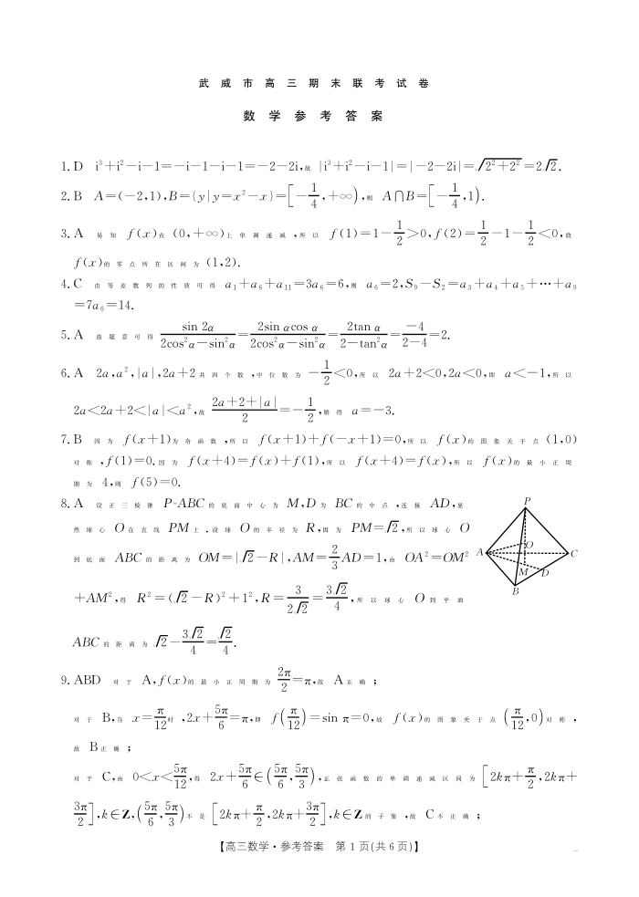 甘肃省武威市2025届高三上学期1月期末联考 数学答案.pdf