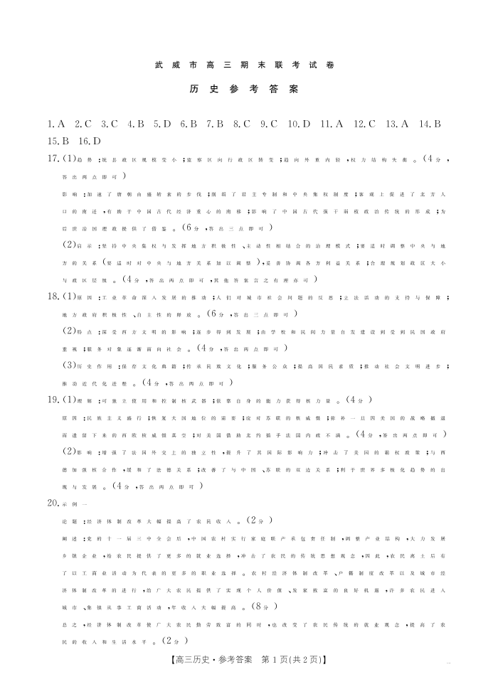 甘肃省武威市2025届高三上学期1月期末联考 历史答案.pdf