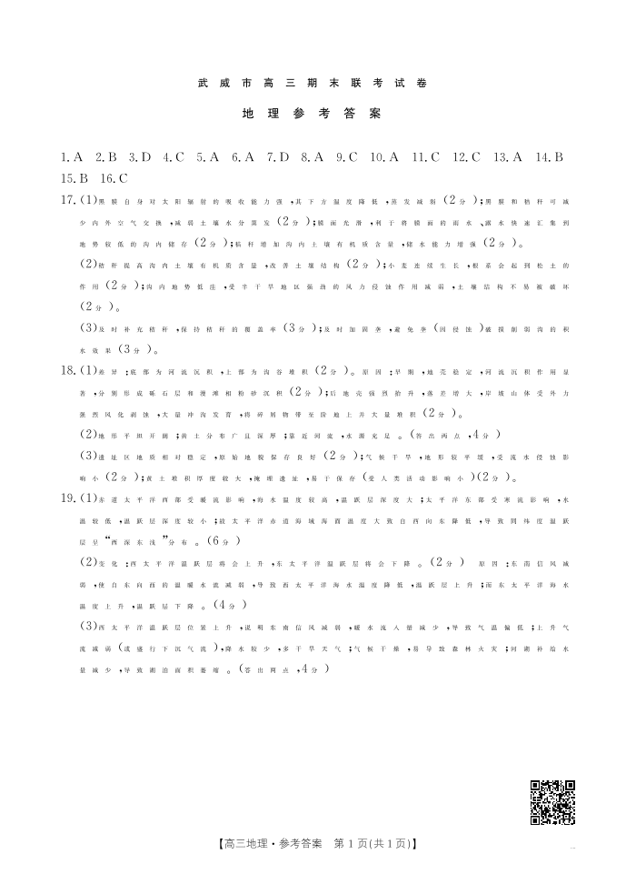 甘肃省武威市2025届高三上学期1月期末联考 地理答案.pdf