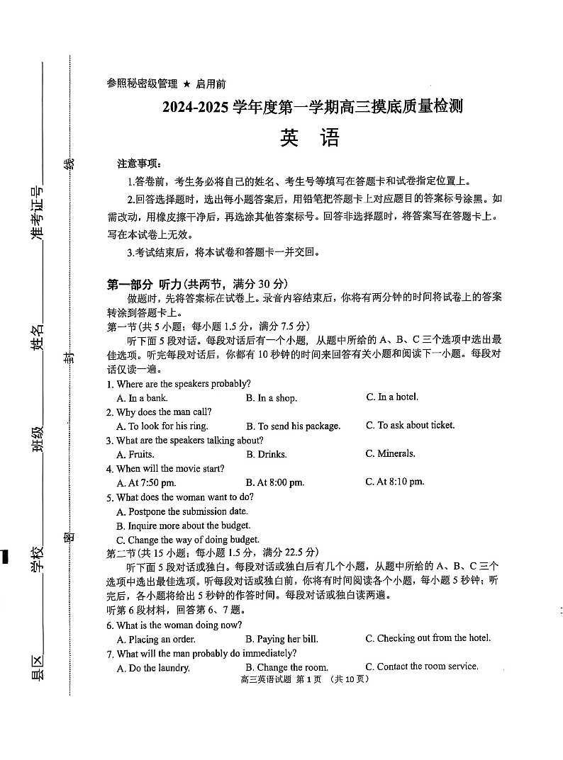 山东省淄博市2024-2025学年第一学期高三期末摸底质量检测 英语.pdf