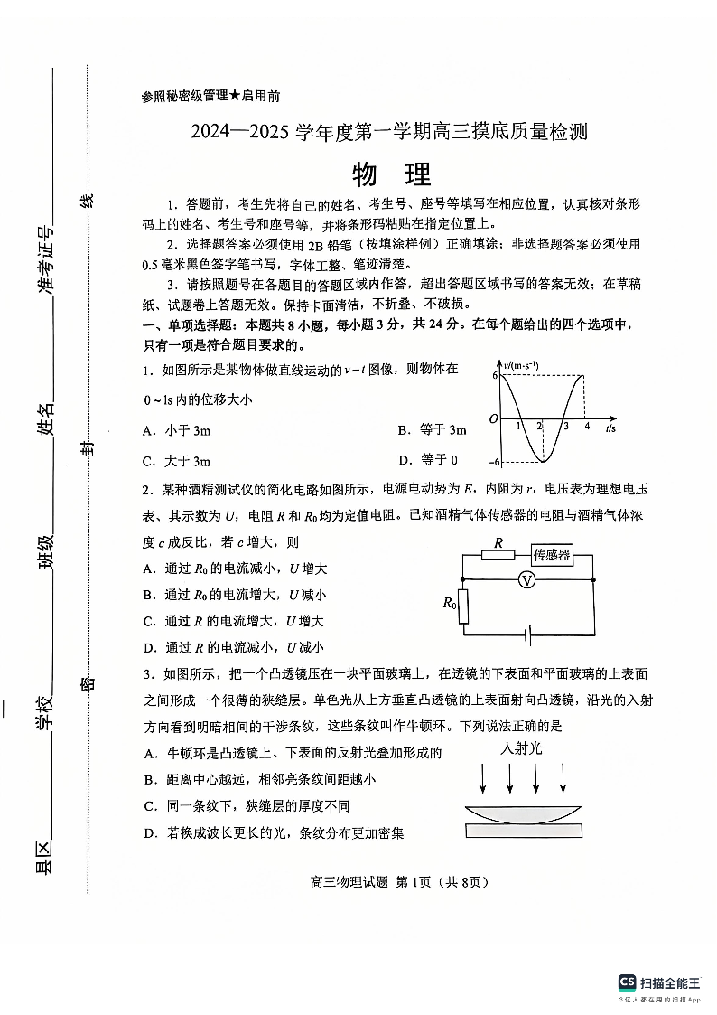 山东省淄博市2024-2025学年第一学期高三期末摸底质量检测 物理.pdf