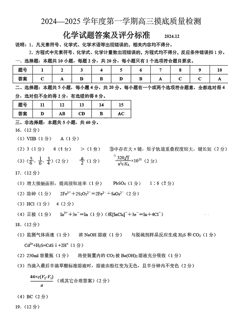 山东省淄博市2024-2025学年第一学期高三期末摸底质量检测 化学答案.pdf