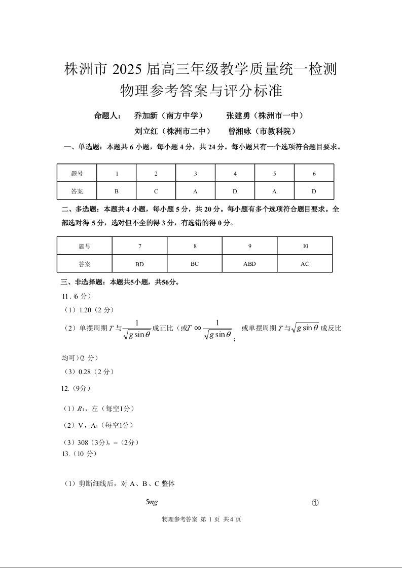 湖南省株洲市2025届高三上学期教学质量统一检测 物理答案.docx