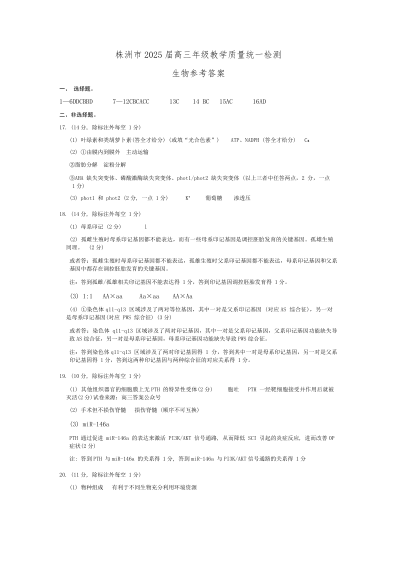 湖南省株洲市2025届高三上学期教学质量统一检测 生物答案.pdf