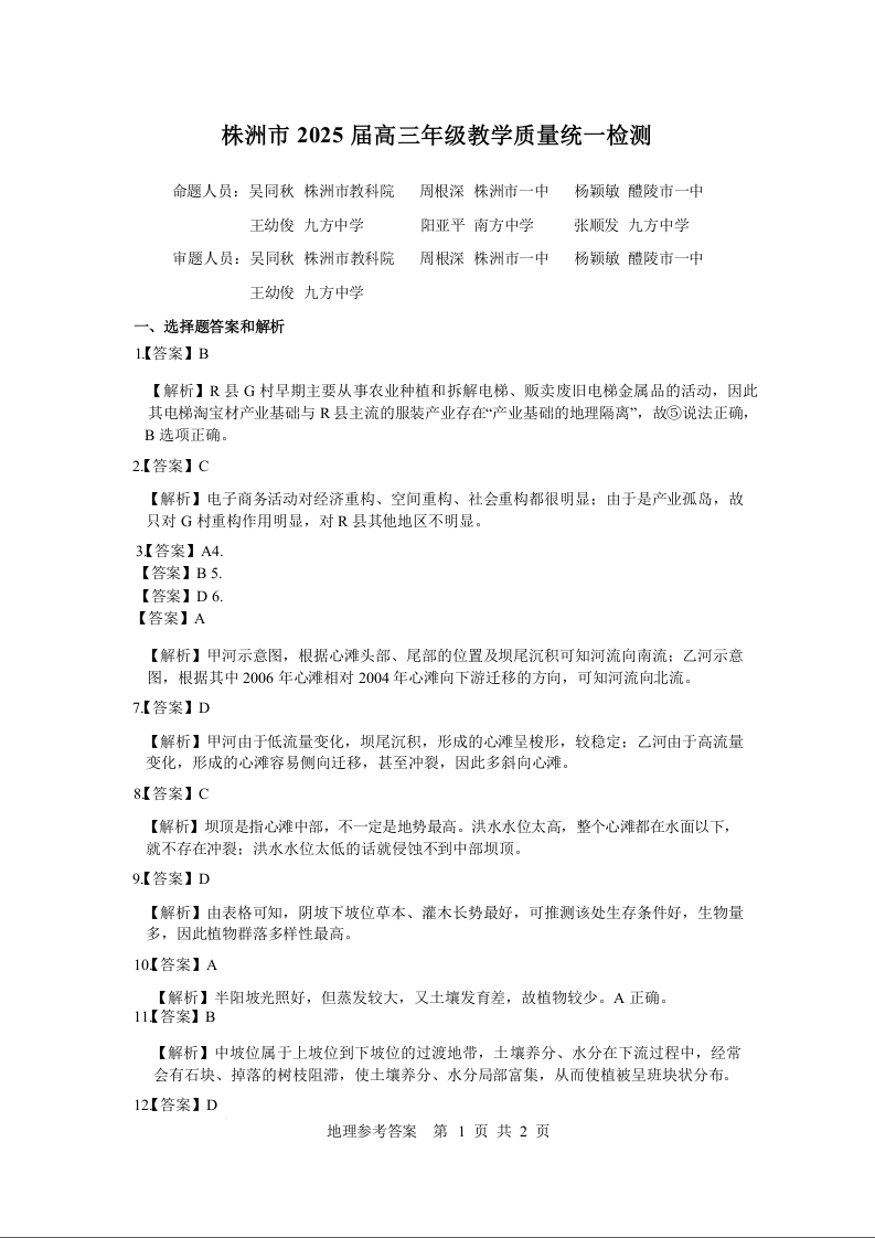 湖南省株洲市2025届高三上学期教学质量统一检测 地理答案.docx