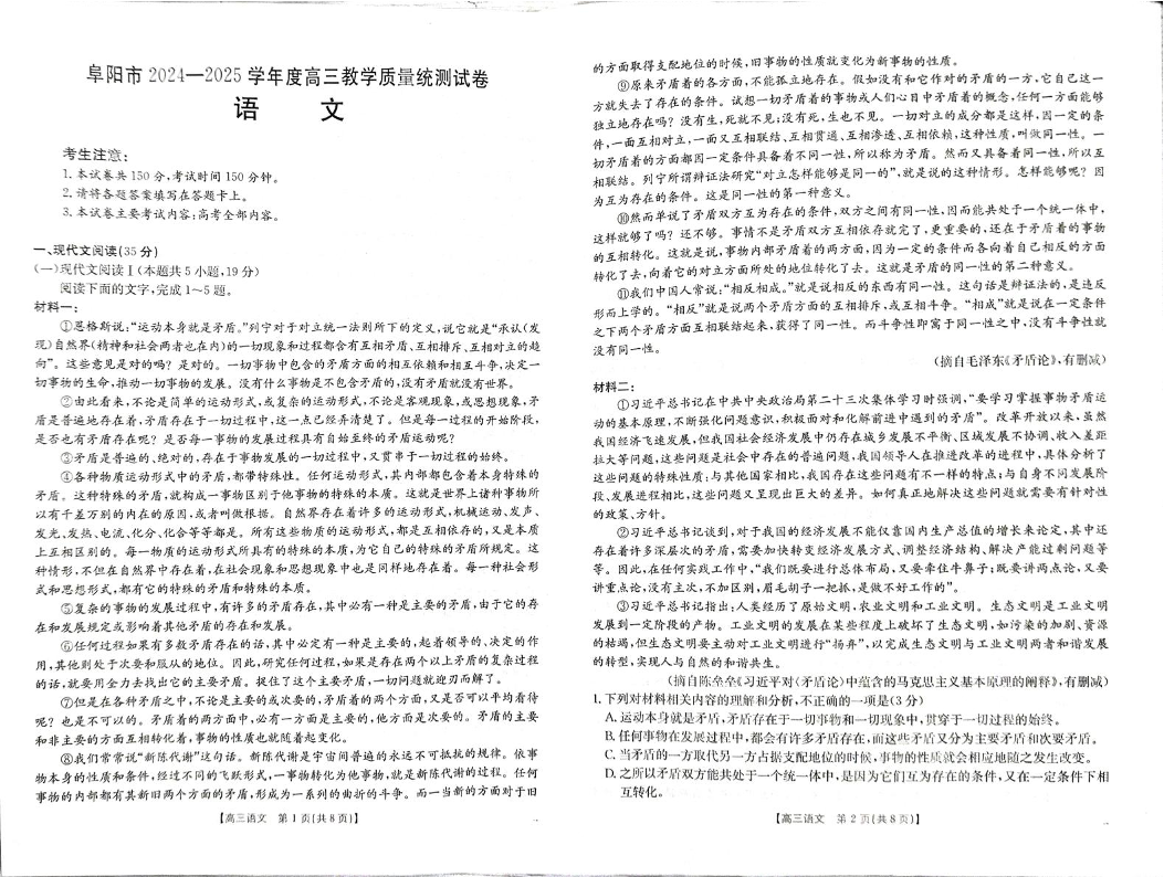安徽省阜阳市2025届高三上学期教学质量统测 语文.pdf