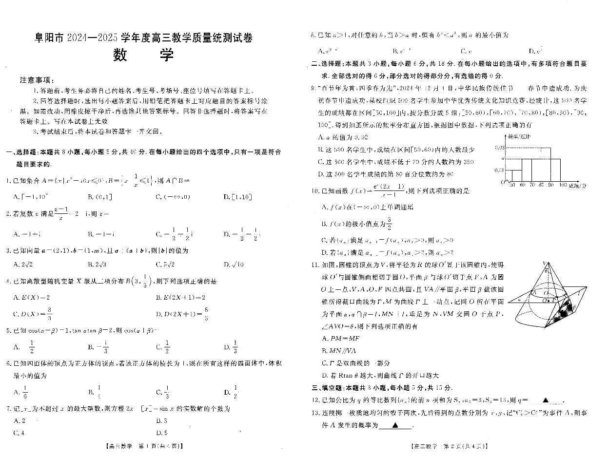 安徽省阜阳市2025届高三上学期教学质量统测 数学.pdf