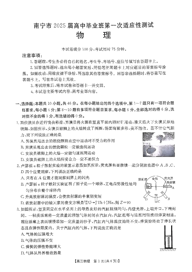 南宁市2025届高中毕业班第一次适应性测试 物理答案.pdf
