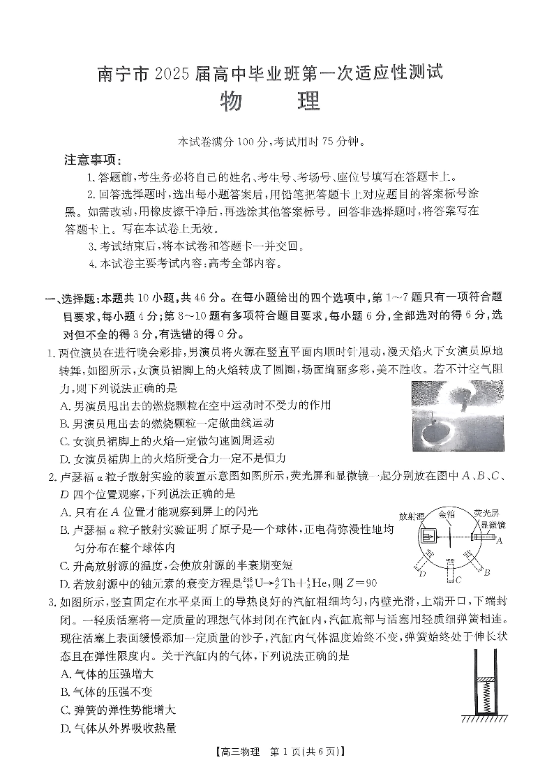 南宁市2025届高中毕业班第一次适应性测试 物理.pdf