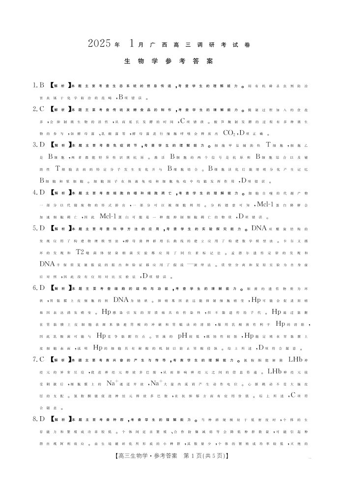 南宁市2025届高中毕业班第一次适应性测试 生物答案.pdf
