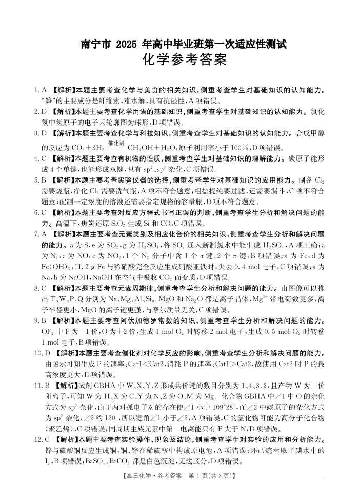 南宁市2025届高中毕业班第一次适应性测试 化学答案.pdf