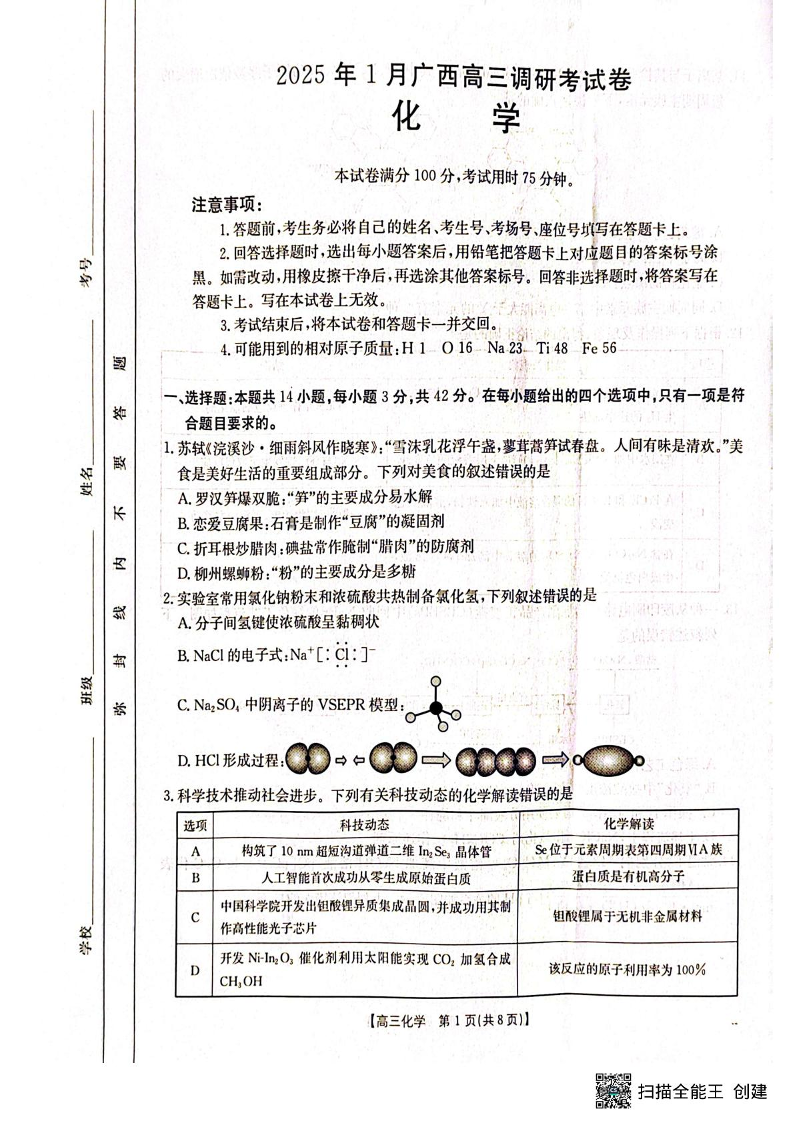 南宁市2025届高中毕业班第一次适应性测试 化学.pdf