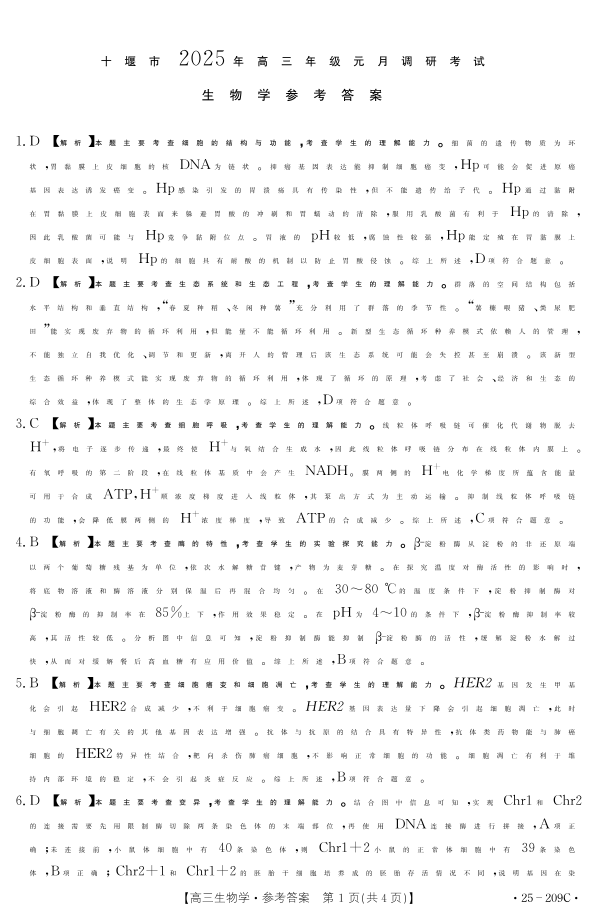 湖北省十堰市2025年高三年级元月调研考试 生物答案.pdf