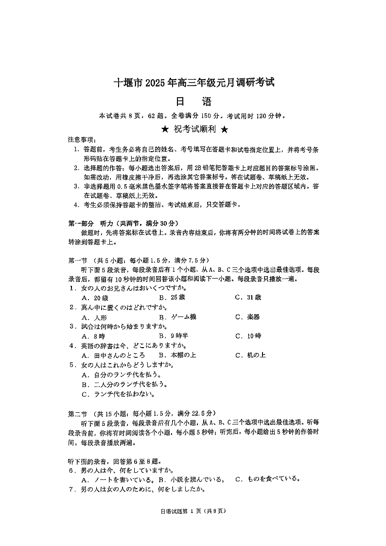 湖北省十堰市2025年高三年级元月调研考试 日语.pdf