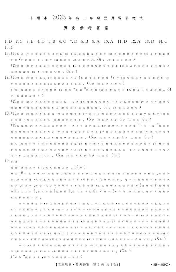 湖北省十堰市2025年高三年级元月调研考试 历史答案.pdf
