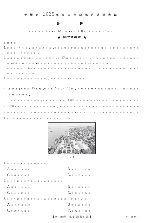 湖北省十堰市2025年高三年级元月调研考试 地理.pdf