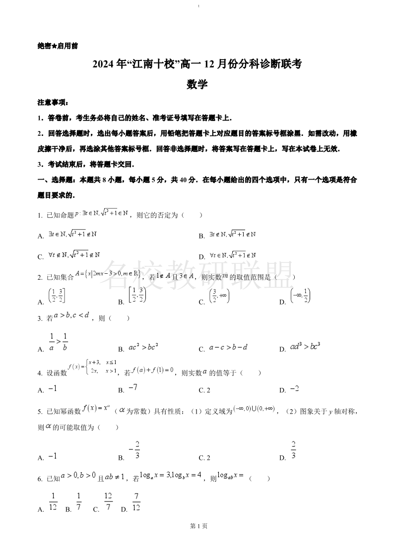 安徽省江南十校2024-2025学年高一上学期12月份分科诊断考试 数学答案.pdf