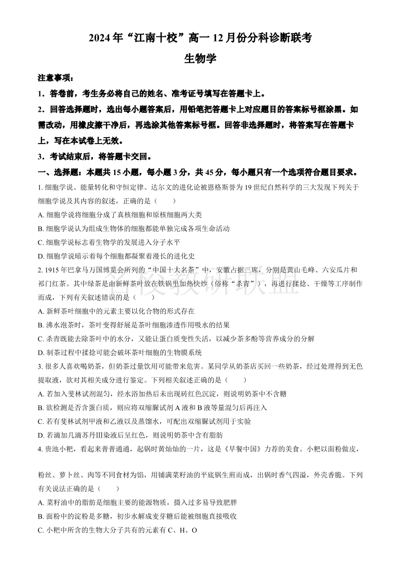 安徽省江南十校2024-2025学年高一上学期12月份分科诊断考试 生物.pdf