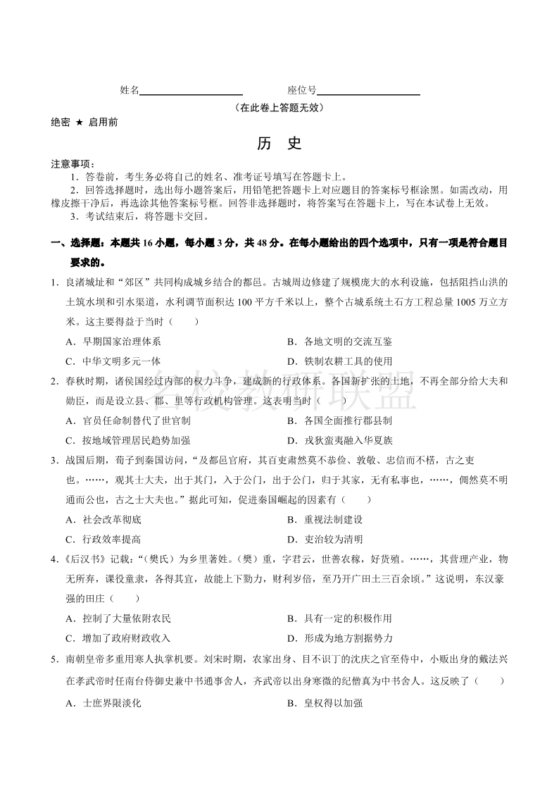 安徽省江南十校2024-2025学年高一上学期12月份分科诊断考试 历史.pdf