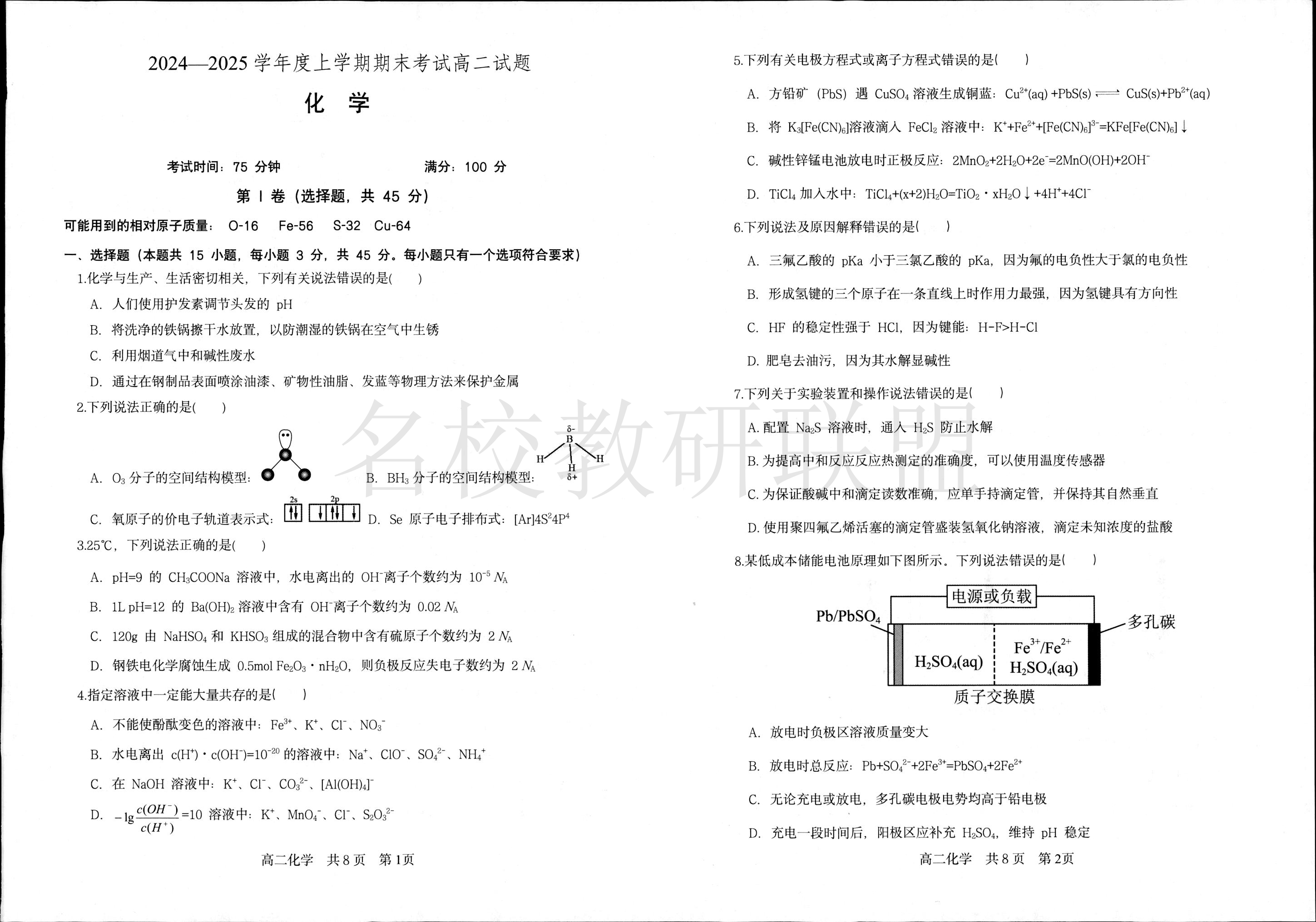 辽宁省抚顺市第一中学2024-2025学年高二上学期期末考试 化学.pdf