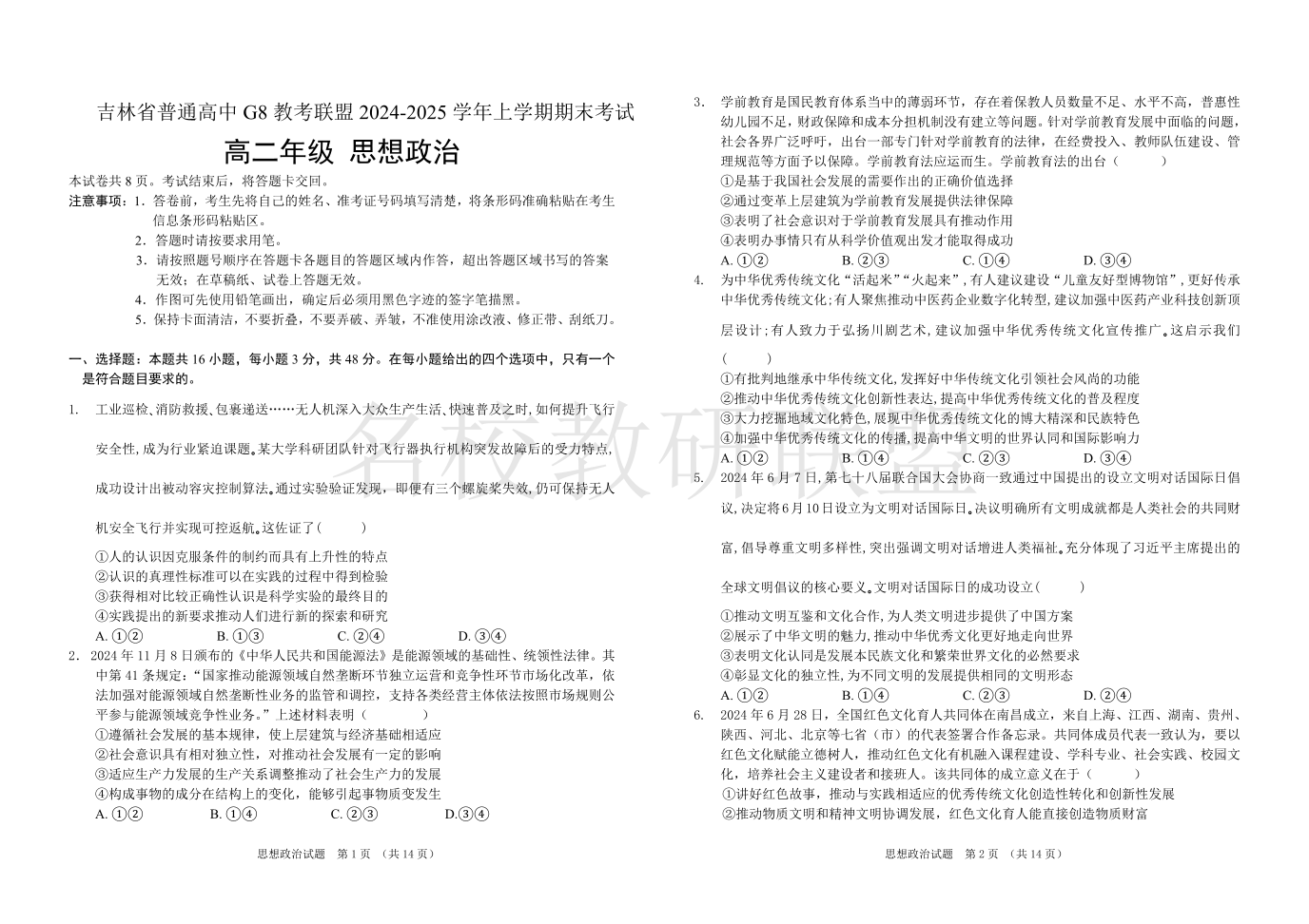 吉林省普通高中G8教考联盟2024-2025学年高二上学期期末考试 政治.pdf