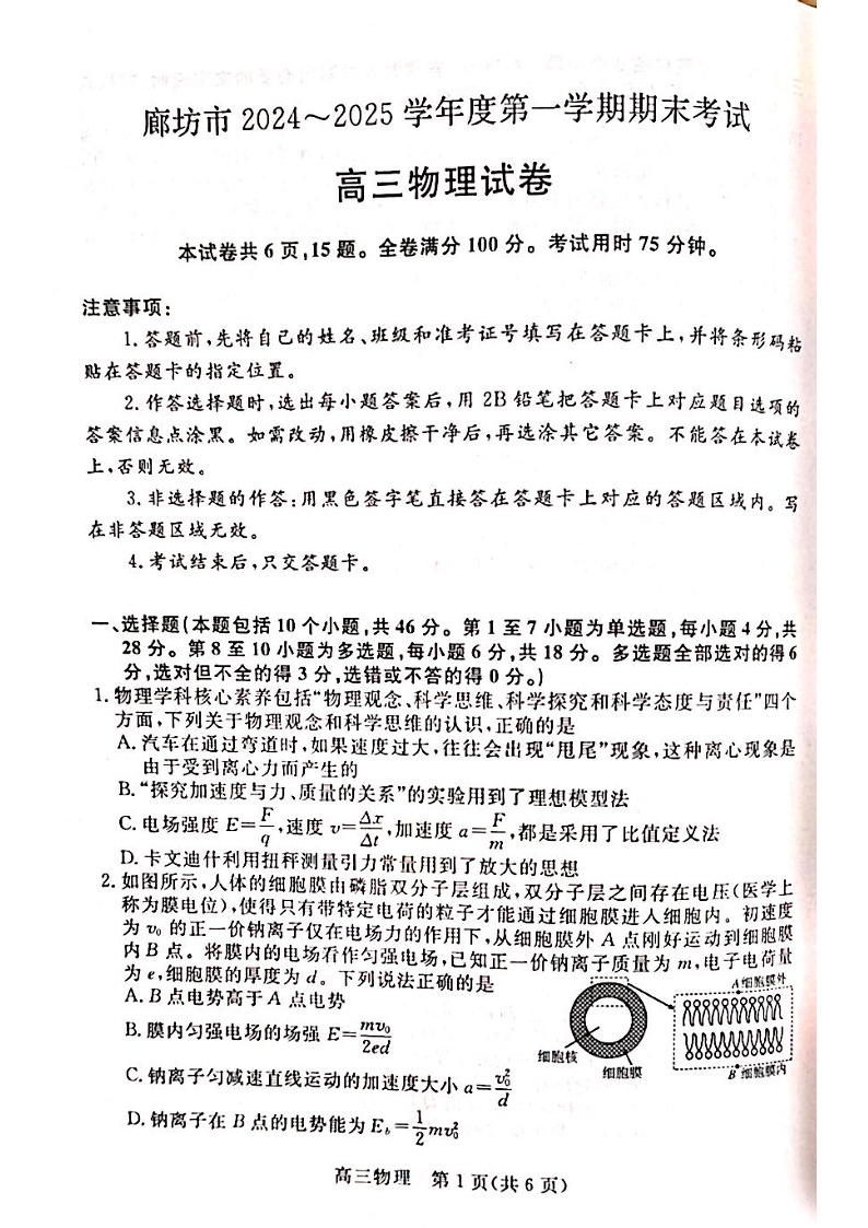 河北省廊坊市2025届高三上学期1月期末考试 物理.pdf