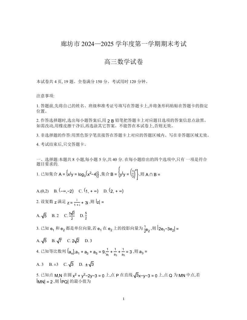 河北省廊坊市2025届高三上学期1月期末考试 数学.docx