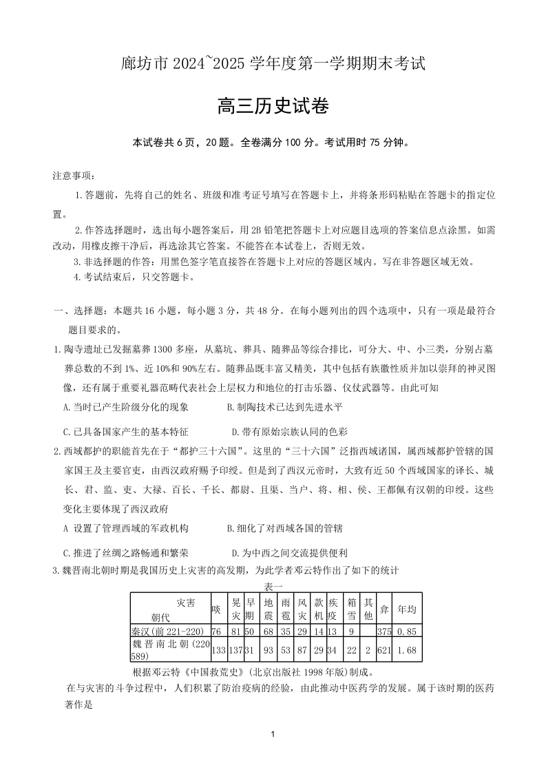 河北省廊坊市2025届高三上学期1月期末考试 历史.docx