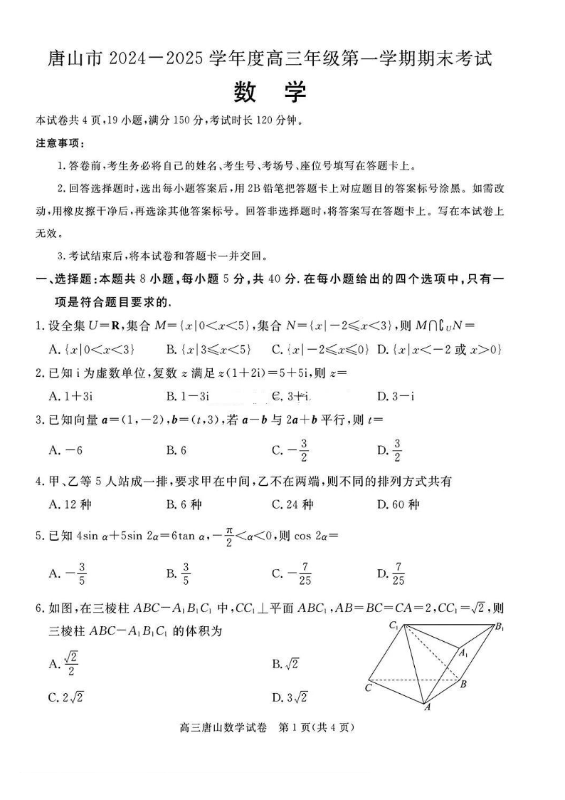 河北省唐山市2024-2025学年度高三年级第一学期期末考试 数学.pdf