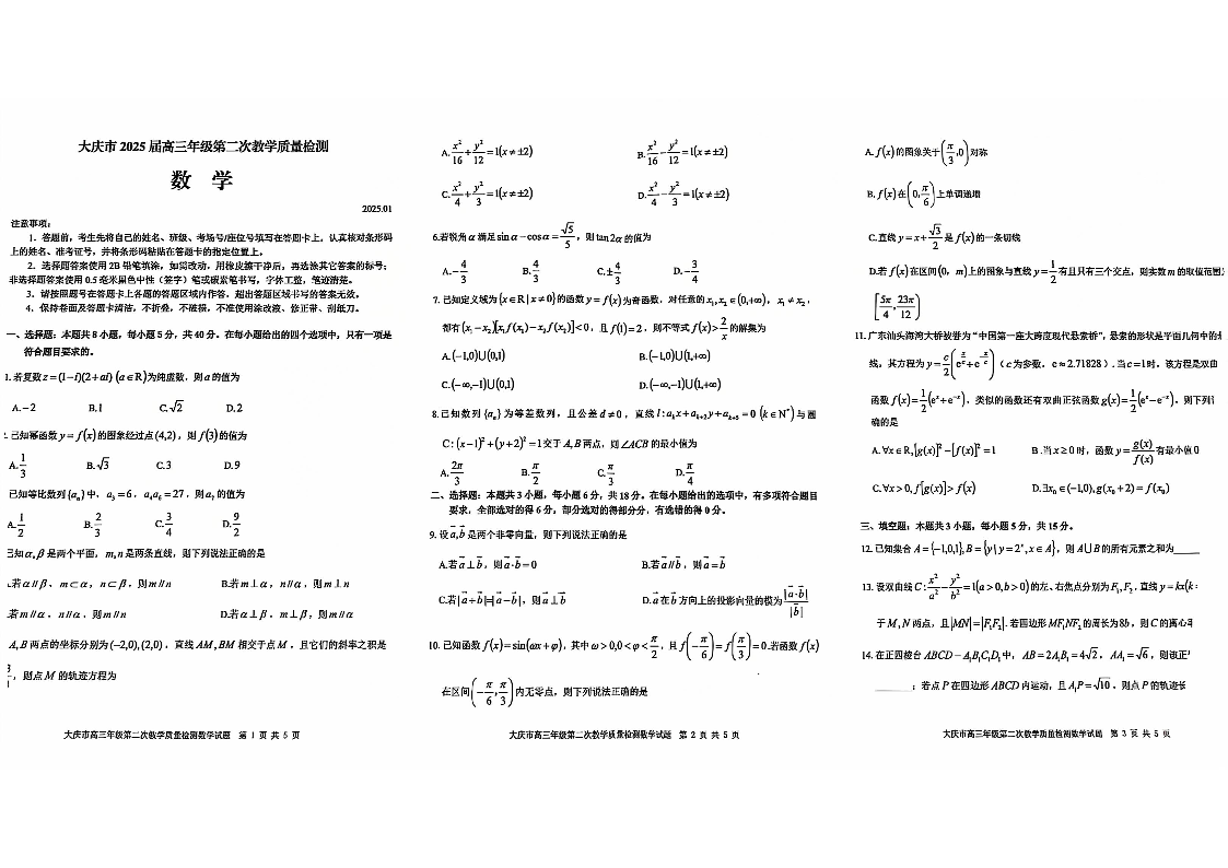 黑龙江省大庆市2025届高三年级第二次教学质量检测 数学.pdf