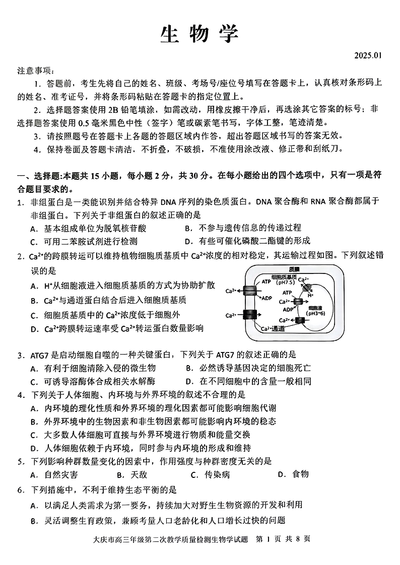 黑龙江省大庆市2025届高三年级第二次教学质量检测 生物.pdf