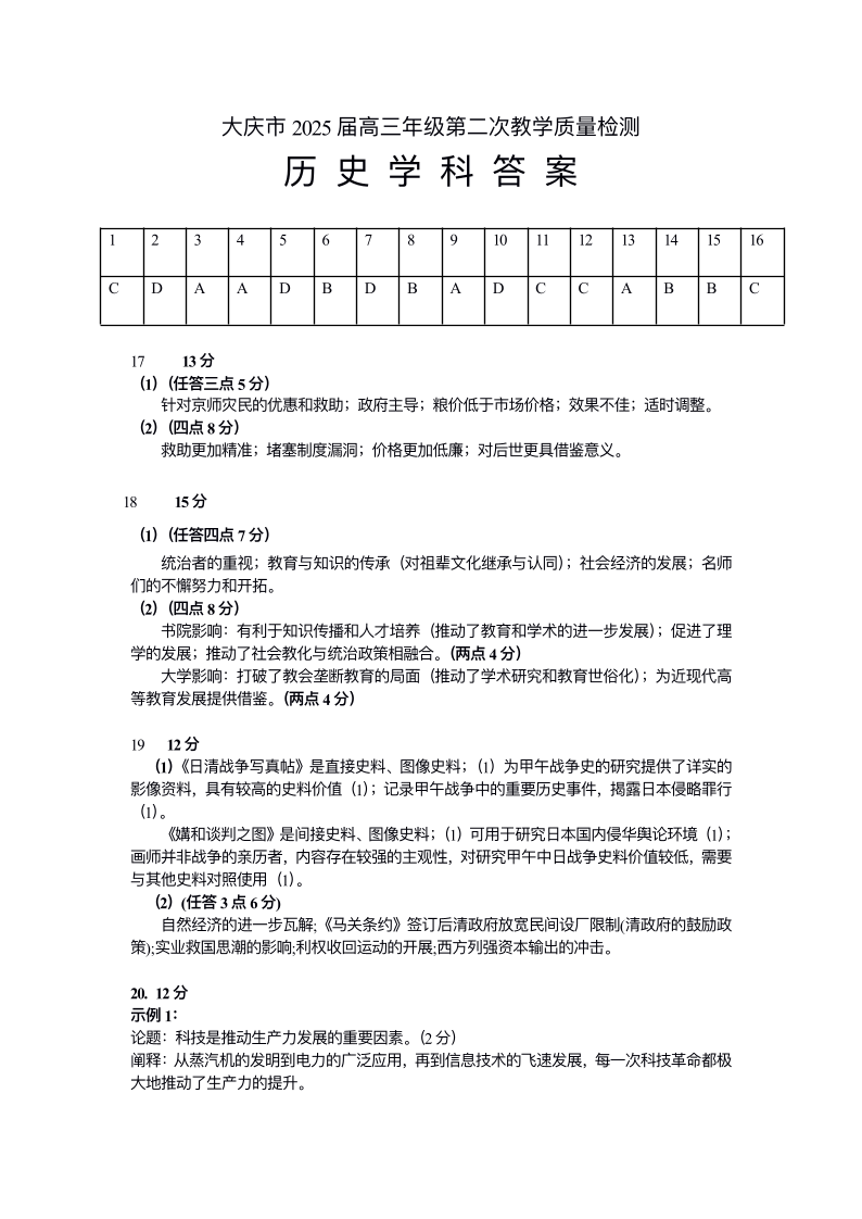 黑龙江省大庆市2025届高三年级第二次教学质量检测 历史答案.pdf