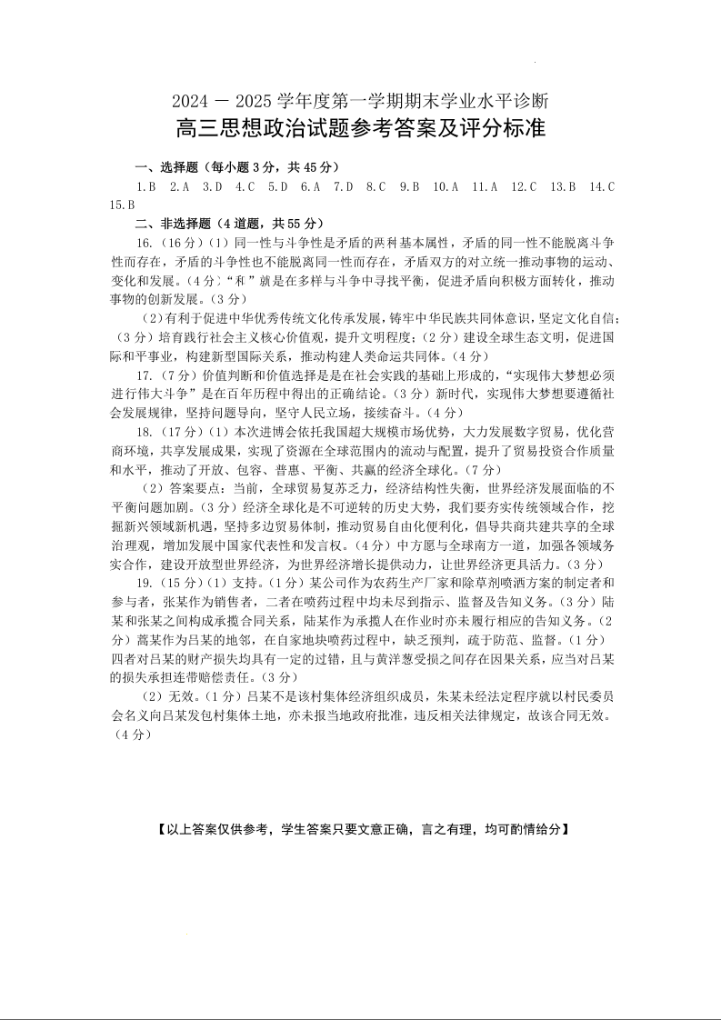 山东省烟台市2025届高三上学期1月期末考试 政治答案.docx