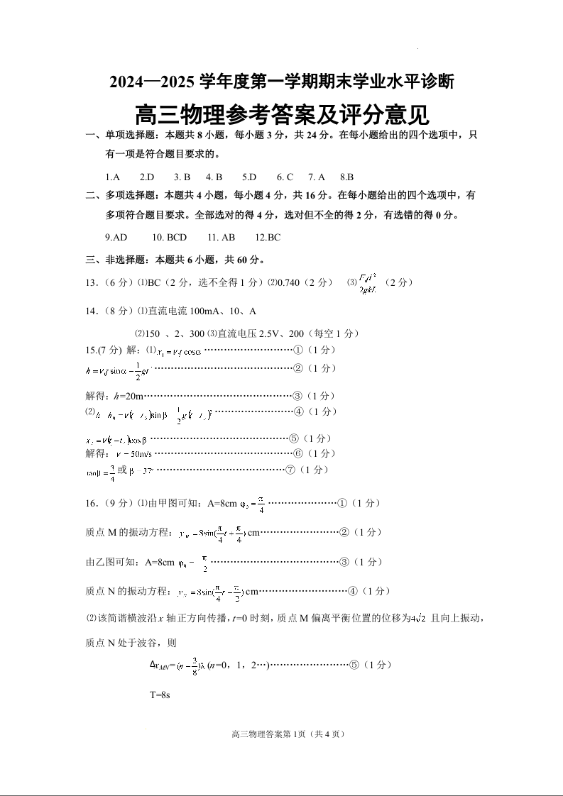 山东省烟台市2025届高三上学期1月期末考试 物理答案.docx