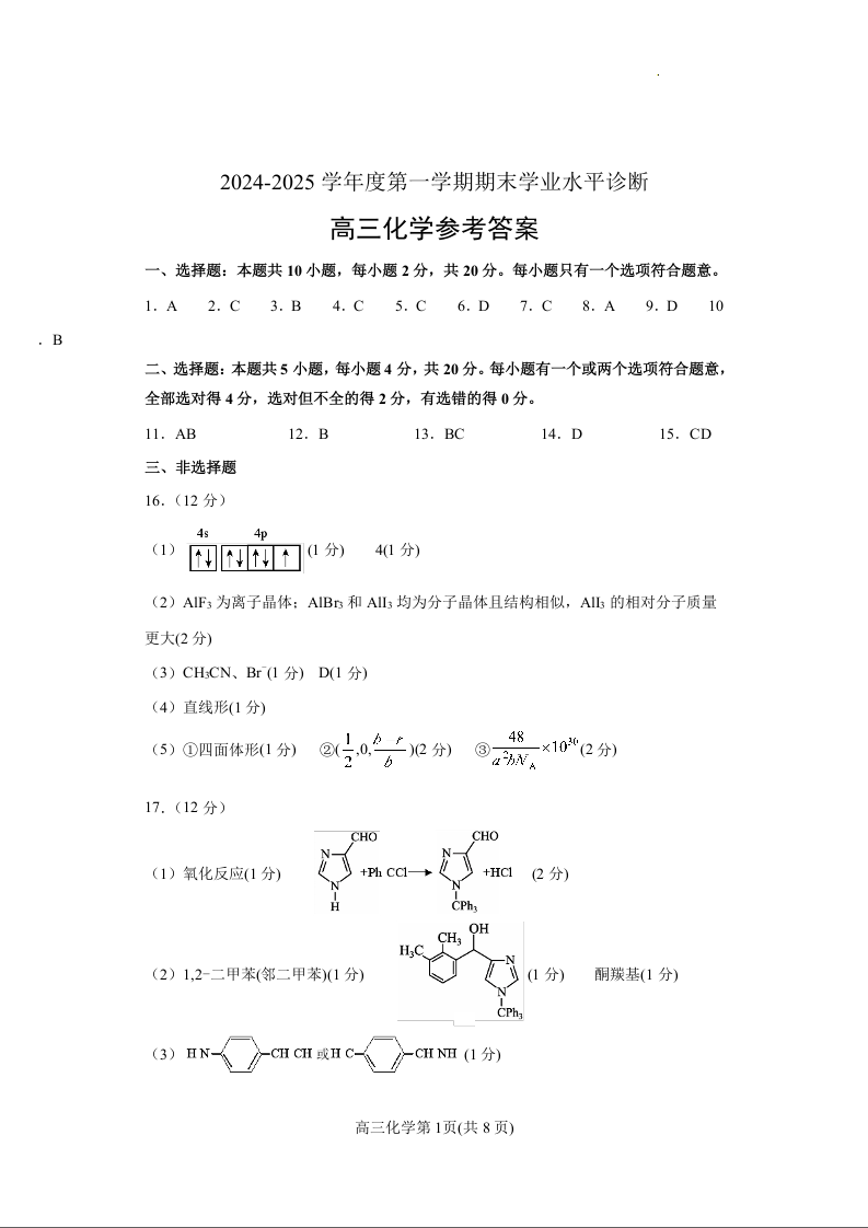 山东省烟台市2025届高三上学期1月期末考试 化学答案.docx