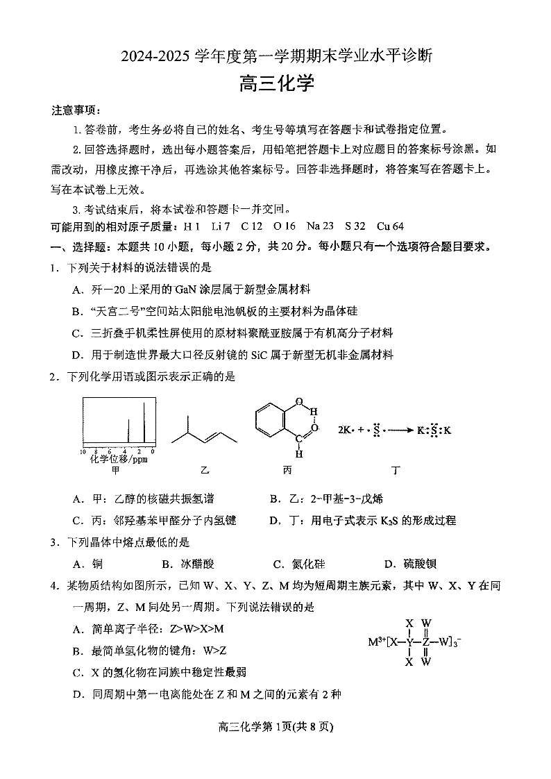 山东省烟台市2025届高三上学期1月期末考试 化学.pdf