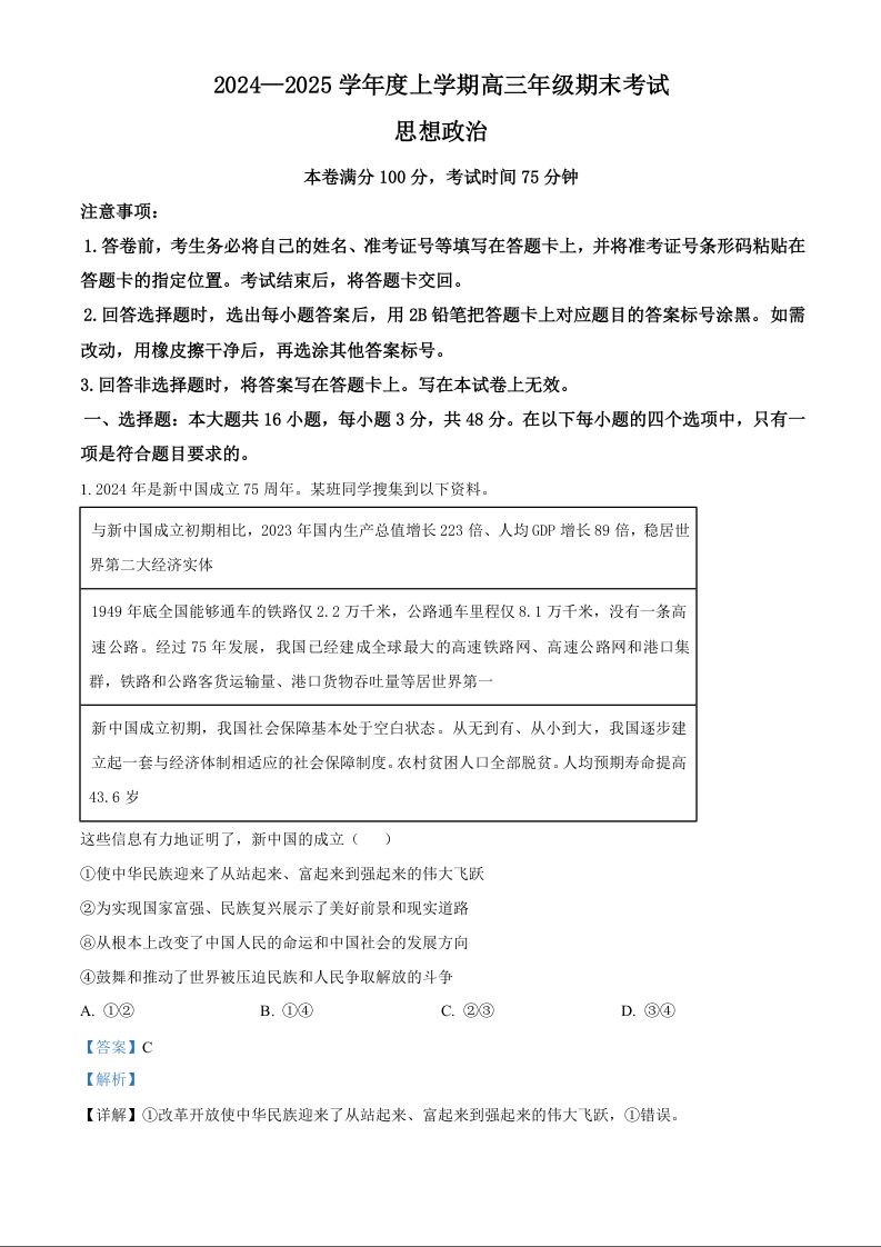 点石联考 上学期高三期末 政治答案.docx