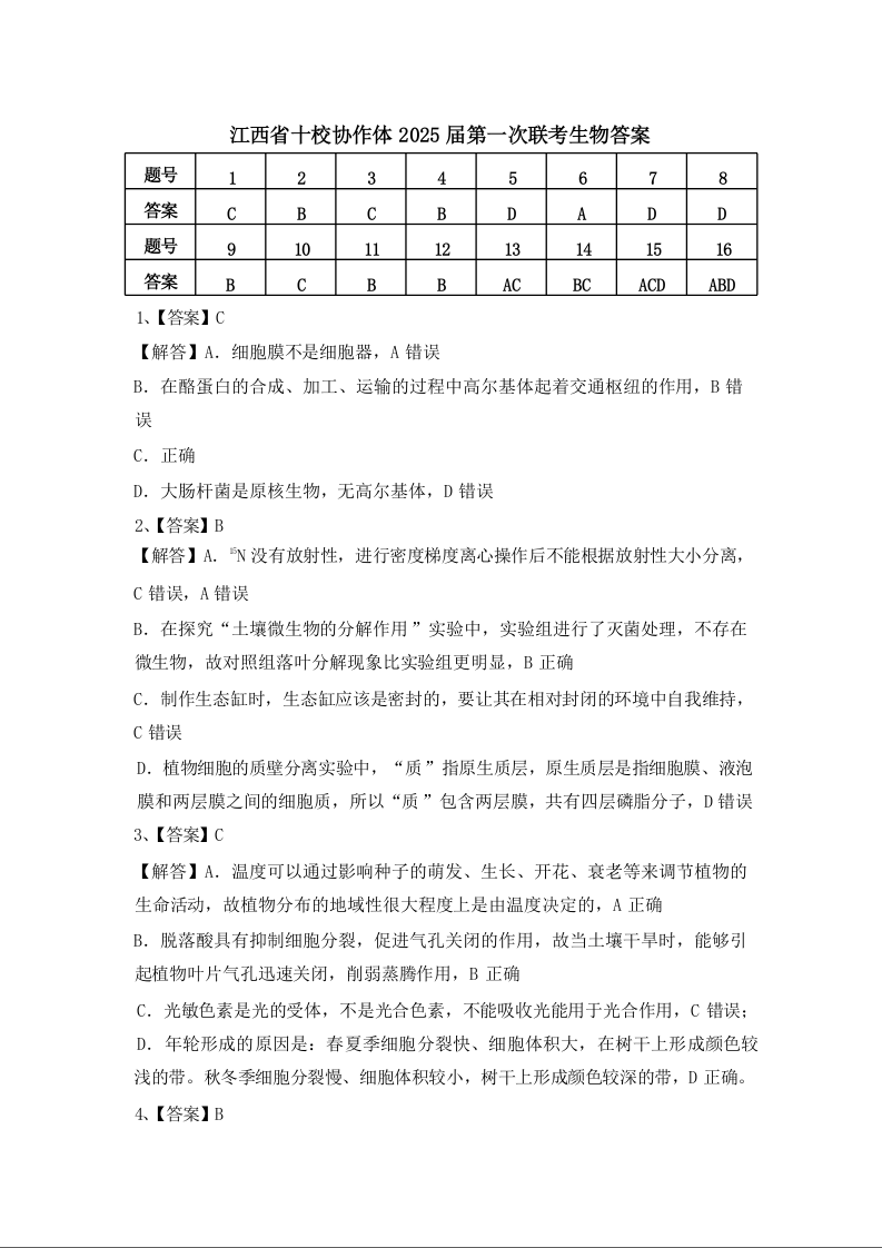 江西省十校协作体2025届高三第一次联考 生物答案.docx