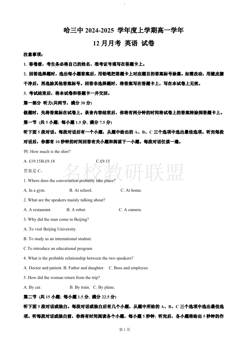 哈尔滨市第三中学2024-2025学年高一上学期12月月考 英语.pdf