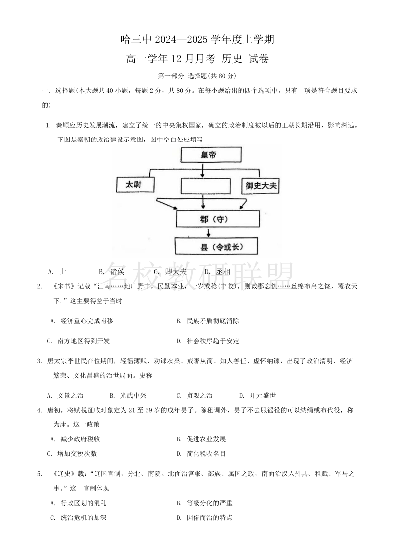 哈尔滨市第三中学2024-2025学年高一上学期12月月考 历史.pdf