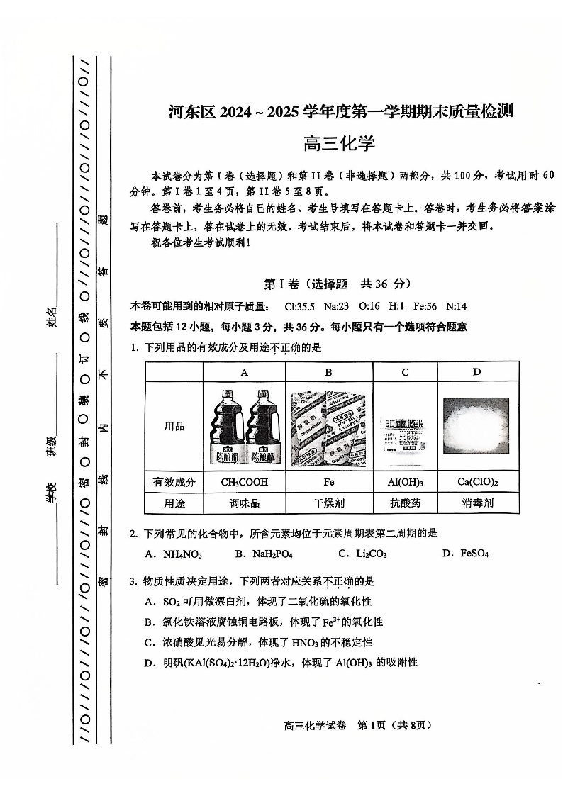 天津市河东区2025届高三第一学期期末质量检测 化学.pdf