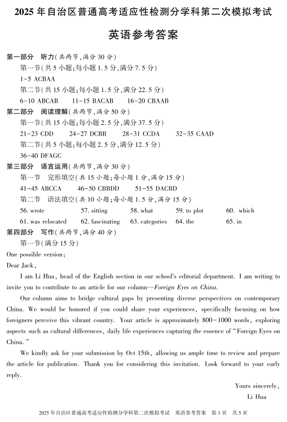 英语答案 2025自治区分学科第二次模拟考试.pdf