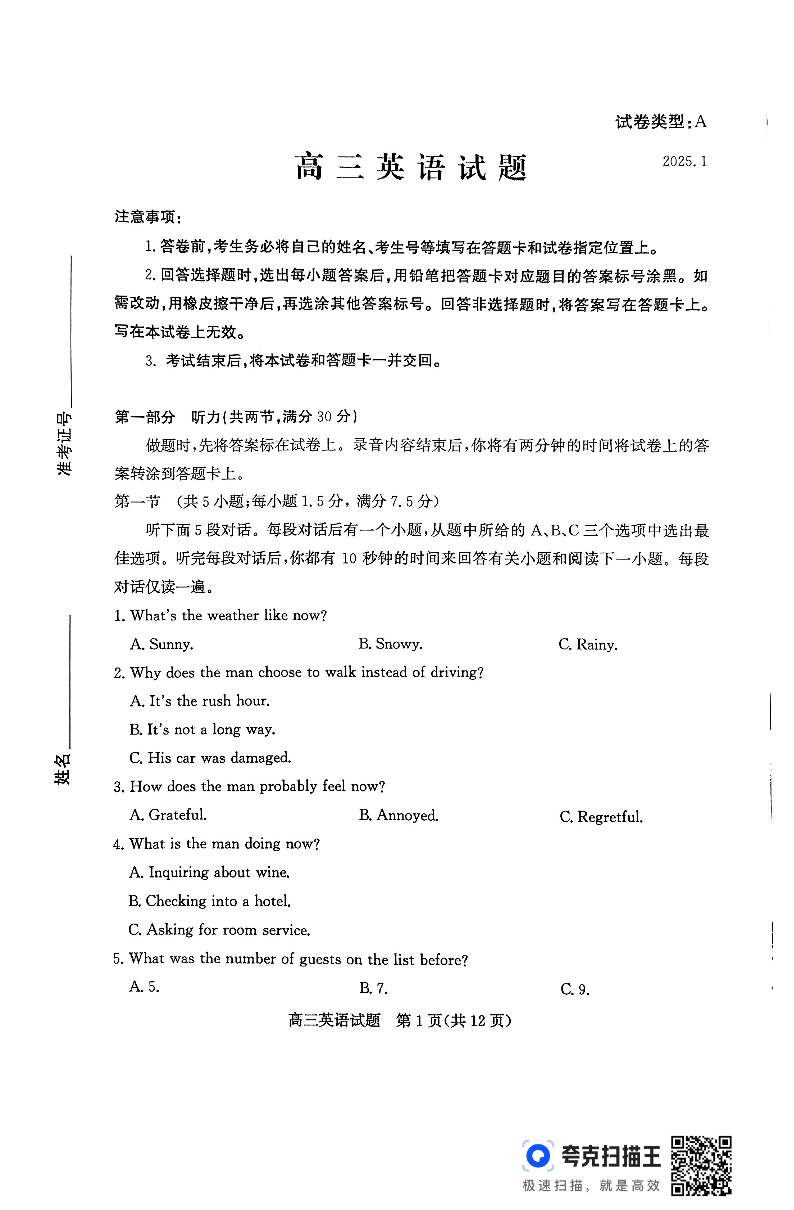 山东省滨州市2025届高三上学期1月期末考试 英语.pdf