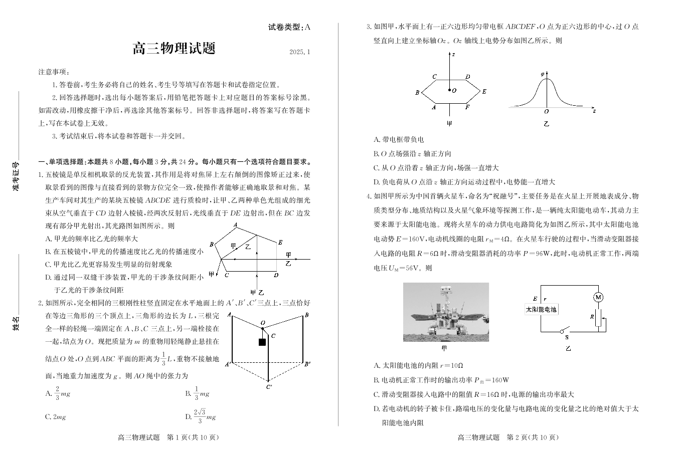 山东省滨州市2025届高三上学期1月期末考试 物理.pdf