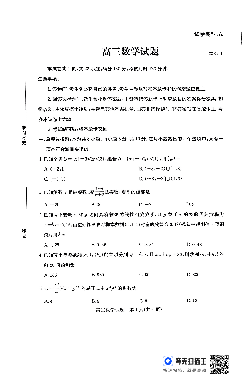 山东省滨州市2025届高三上学期1月期末考试 数学.pdf
