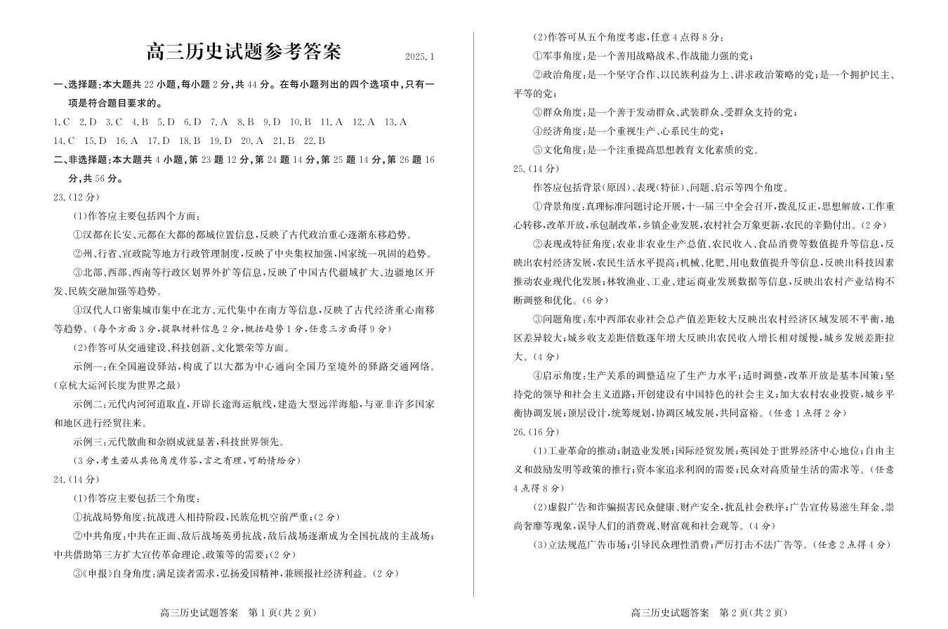 山东省滨州市2025届高三上学期1月期末考试 历史答案.pdf